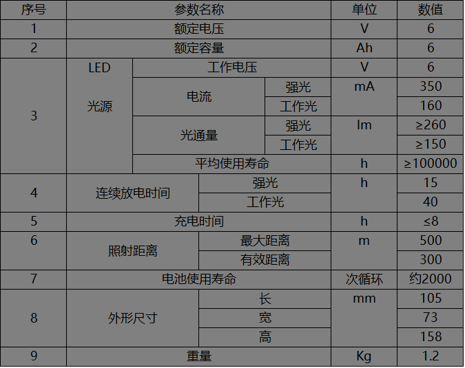 ◆ 選用大功率LED光源,具有節(jié)能長壽的特點,光強度高,強光射程達500米,有效照距達300米,連續(xù)使用時間可達15小時,既可適應長時間作業(yè)的需要,也可停電應急照明。